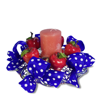 Fruchtiger Tüpfelkreis mit lecker Kerze: der Apfelring. Silberschale, Schleifen, Äpfel – und Kerze. 12 x 15 x 15 cm